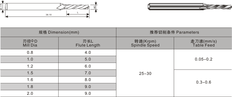 双刃型铣刀,适用于特别板材的成型加工,如铝基板、紫铜箔板等,具有切削锋利,排屑性能记好等特点。